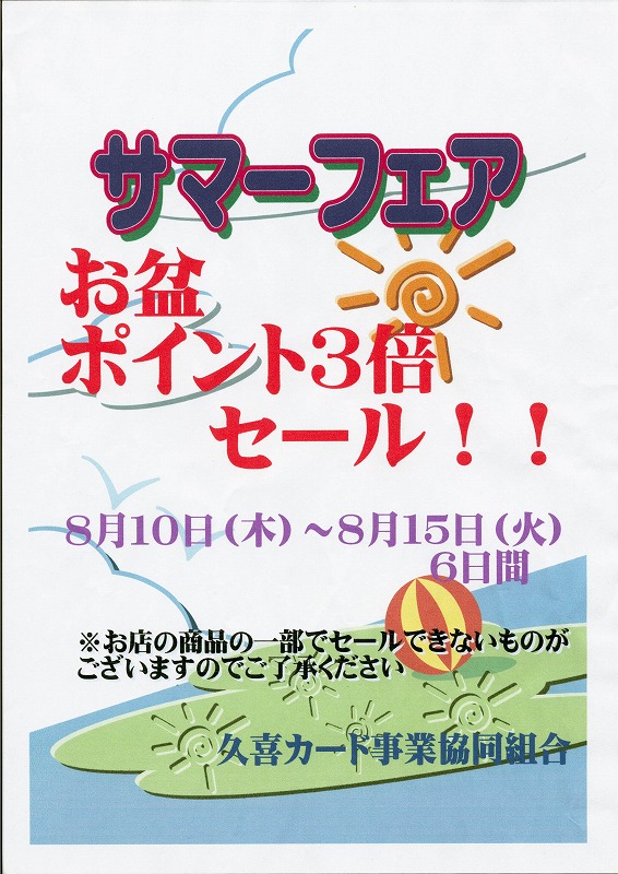 ただ今、ポイントカード加盟店にてお盆3倍セールを開催中です。期間は平成18年8月10日(木)〜平成18年8月15日(火)の6日間です。この期間でお買い物をすると大変お得です!